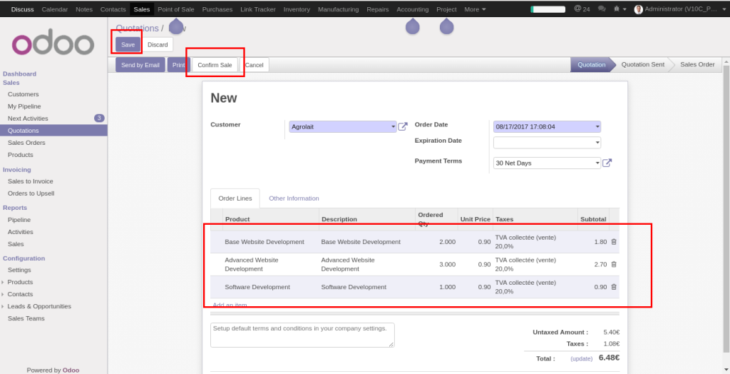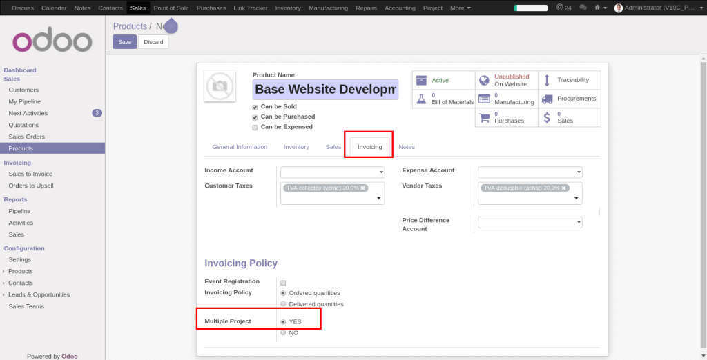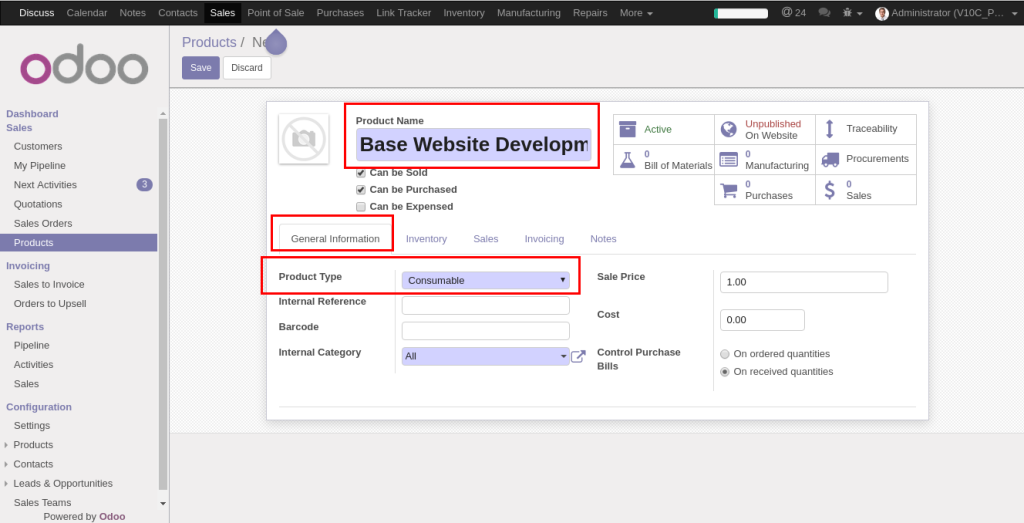 Go to Sales –> Product –> Click on Create . Now create a new product named “Base Website Development”.